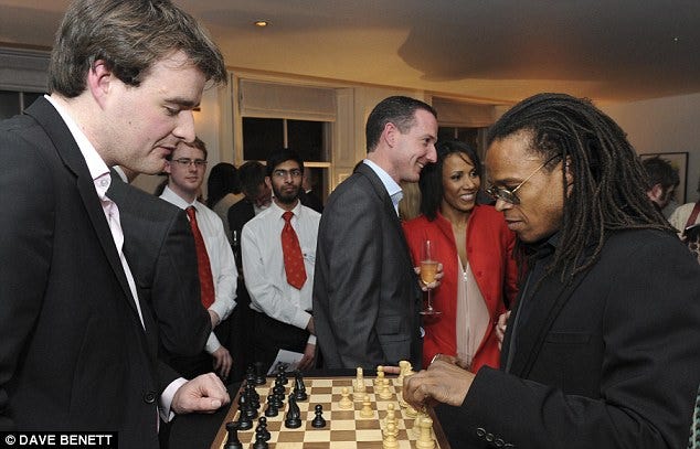 Un altro grande appassionato del gioco è l’olandese Edgar Davids, che quando militava nella Juventus frequentava regolarmente la Società Scacchistica Torinese, dove ha anche seguito le lezioni dei Maestri del club. Quando nel novembre del 2002 l’ex campione del mondo Anatolij Karpov si esibì a Torino in una ‘simultanea’ giocando contemporaneamente contro 24 avversari, tra questi era stato annunciato anche Edgar Davids; e – udite udite – il calciatore si presentò all’appuntamento. Io coordinavo l’esibizione ma quando invitai Davids ad accomodarsi non volle sedersi al tavolo da gioco: «Con Karpov perderei di sicuro, e a me perdere non piace», si giustificò l’olandese. Ma restò tutto il tempo a seguire le partite e a rilasciare interviste ai molti giornalisti e alle molte troupe televisive accorsi (forse) più per lui che per Karpov.